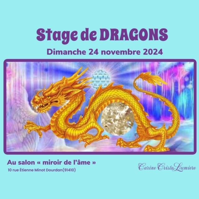 STAGE DRAGONS 08 Décembre 2024 Sache que si tu est appelée par ce stage c’est que ton âme a déjà cochée avec un dragon . Les Dragons sont venus me rencontrer il y 8 ans de cela. Et depuis ne m’ont plus quittés🙏🏻 Gratitude 🙏🏻✨✨✨ Résumé de la journée: Chaque personne présente rencontrera son propre Dragon🐉 Et nous recevrons des informations sur lui ainsi que la raison de sa présence . Ensemble , nous découvrirons comment travailler avec eux pour : -nous nettoyer rapidement et puissamment -nettoyer notre environnement -renforcer notre taux vibratoire - Être dans le discernement -travailler avec leur Énergie Guérisseuse. -pourquoi maintenant🥹 Et tous le reste sera à découvrir sur place ✨✨✨car il ne dévoilent pas leur secret à tout le monde 😉 Sachez que ce sont toujours eux qui me demandent d’animer ces stages✨✨✨ Le dernier remonte à 4 ans Si toi aussi tu souhaites pendre conscience que tu es un(e) dragonnier(e) 😉 Inscris toi et viens vivre de grands moments de découvertes d’échanges et de partages avec ton nouvel ami🐉🫶🏻 ‼️( nombre de places limitées) Rendez-vous Le dimanche 08 Décembre 2024 De 10h à 18h30 salon « Miroir de l’âme » 10 rue Étienne Minot 91410 Dourdan ( environ 1h de pause pour le déjeuner) Tarif :120€ Dont un acompte de 50€ Pour confirmer l’inscription.