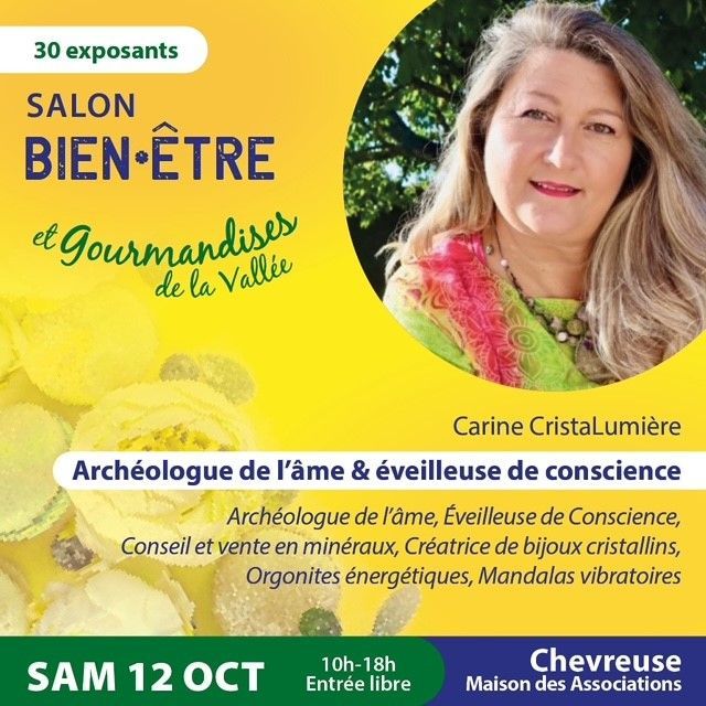 Faire découvrir les métiers du bien-être, voici l'ambition du Salon Bien-être et Gourmandises de la Vallée. Samedi 12 octobre, venez rencontrer Carine CristaLumière, Archéologue de l’âme et Éveilleuse de Conscience, à Chevreuse Ce qu'elle propose : conseil et vente en minéraux, créatrice de bijoux cristallins, orgonites énergétiques, mandalas vibratoires, . Depuis son plus jeune âge, Carine rêve de vivre dans un monde d’Amour de Paix et de Lumière. Elle a commencé ses accompagnements par la transformation de l’Être au niveau esthétique en tant que coiffeuse où déjà elle proposait la coiffure de l’âme … En 2013, suite à un accident qui a totalement basculé sa vie, elle s'est mise au service de ses Guides de Lumière. Aujourd’hui elle offre ses Guidances à celles et ceux qui souhaitent prendre conscience de leur Être Divin Et ce à travers ses créations vibratoires, ses séances de Soin Quantiques, ou encore la guidance de votre Constellation cristalline qui répond à la question que chacun se pose "Qui suis-je ? Et pourquoi je me suis incarné dans cette vie ?" Chacun de mes accompagnements et mes créations sont réalisés en Guidance. J’ai foi en l’humanité et tous les règnes qui nous entourent. À mon humble niveau je s ‘« Aime » pour la création de ce nouveau monde. Carine Cristalumiere www.carinecristalumiere.com 06 32 51 62 29 Instagram : carine_cristalumiere Chaîne YouTube : Carine CristaLumière